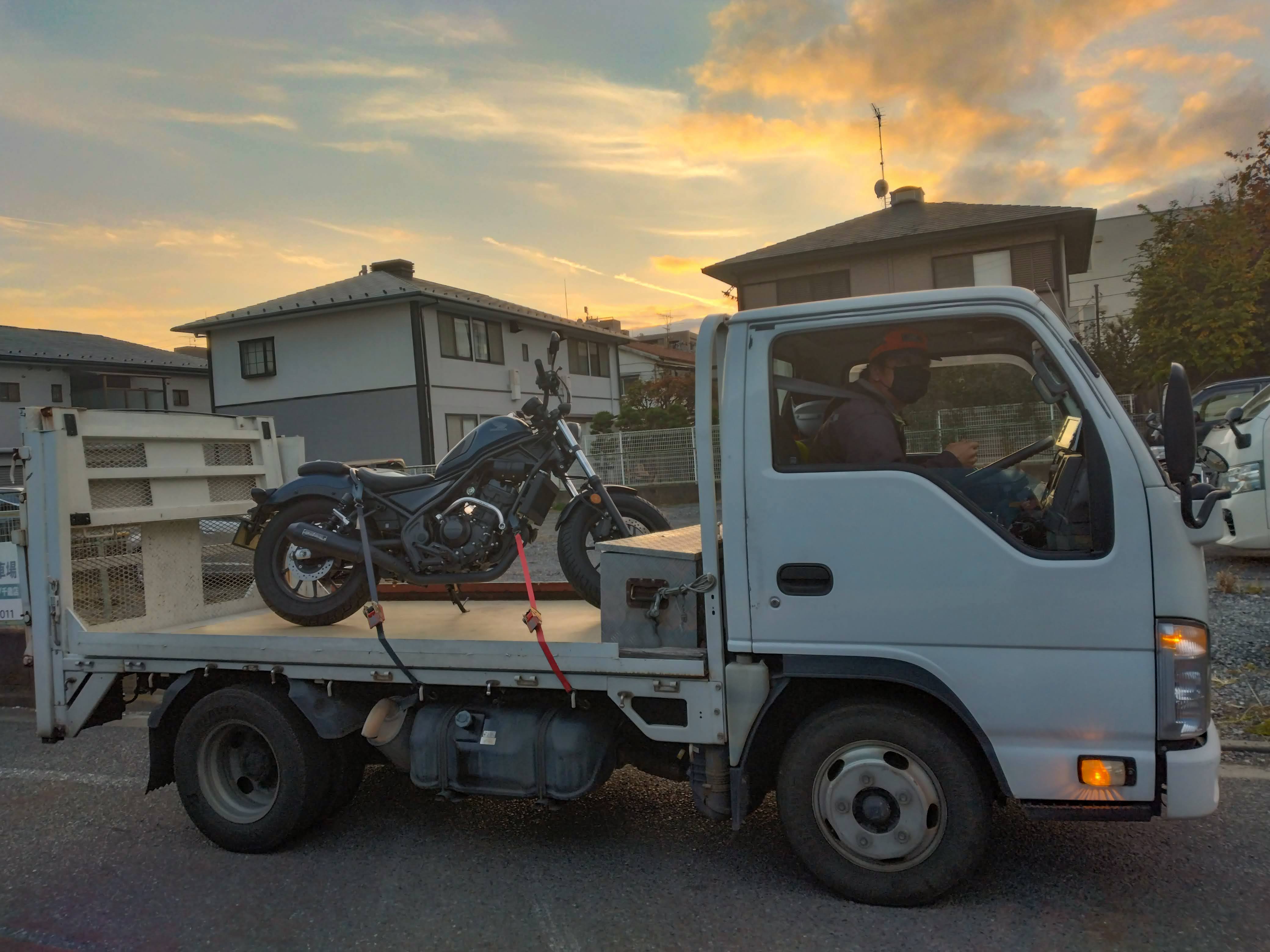ということでJAFのお兄さんのトラックで、いつものバイク屋さんに運んでもらえることになりました。あらかじめ「バッテリーあがりではないと思います」って伝えていたので、荷台にバイクを乗せられるトラックで来てくれていたんです。